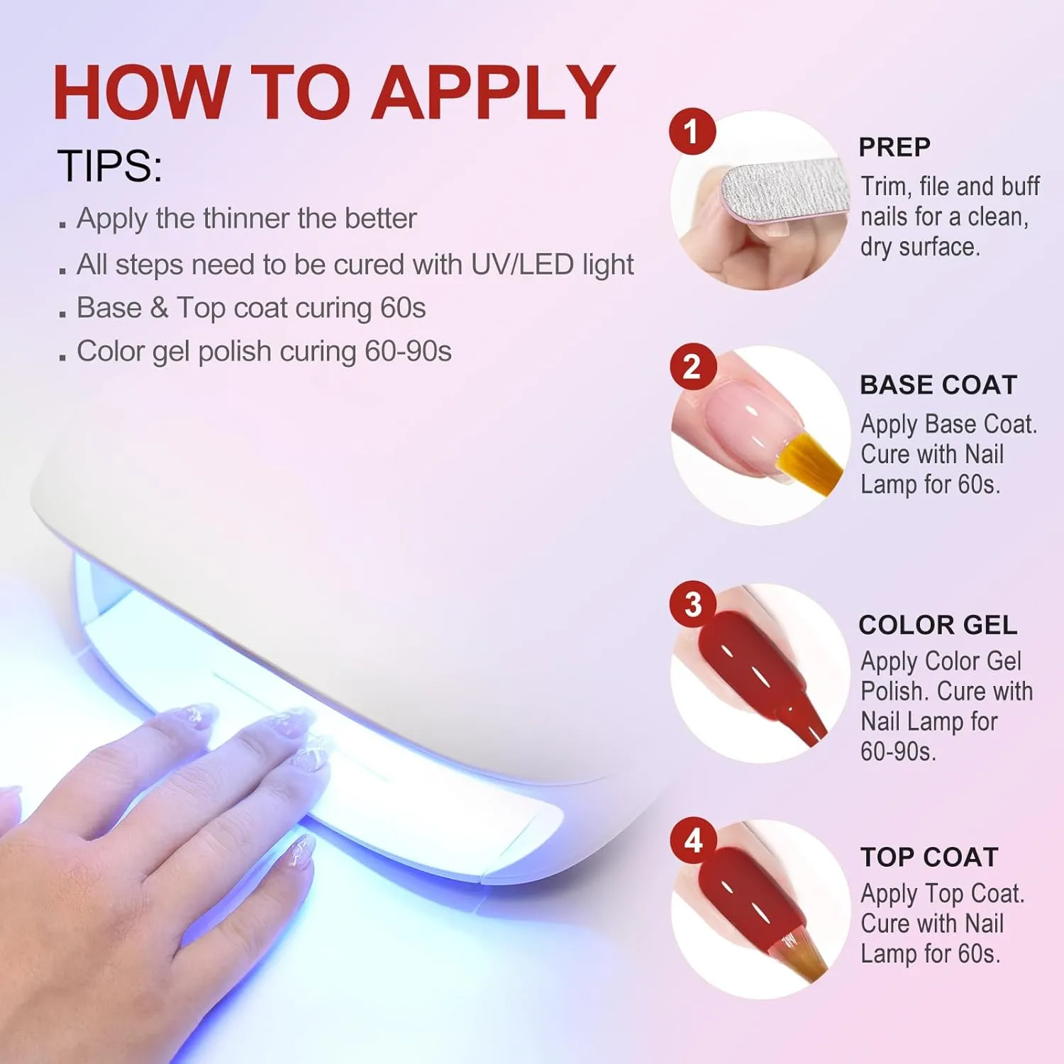 Nanesite base coat (tanki sloj) → sušite u UV/LED lampi ~60 sekundi.